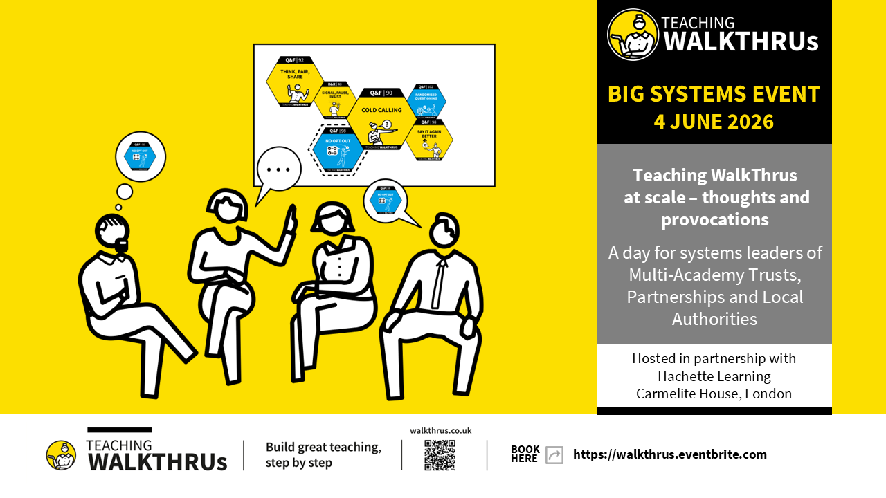This one off free event is aimed at leaders of these systems. Join Tom Sherrington, Matt Stone and Lisa Worgan, as well as invited guests from partner systems, to examine case stories where Teaching WalkThrus has made impact at scale, identifying lessons from cycles of professional development and coaching have caused such successes.